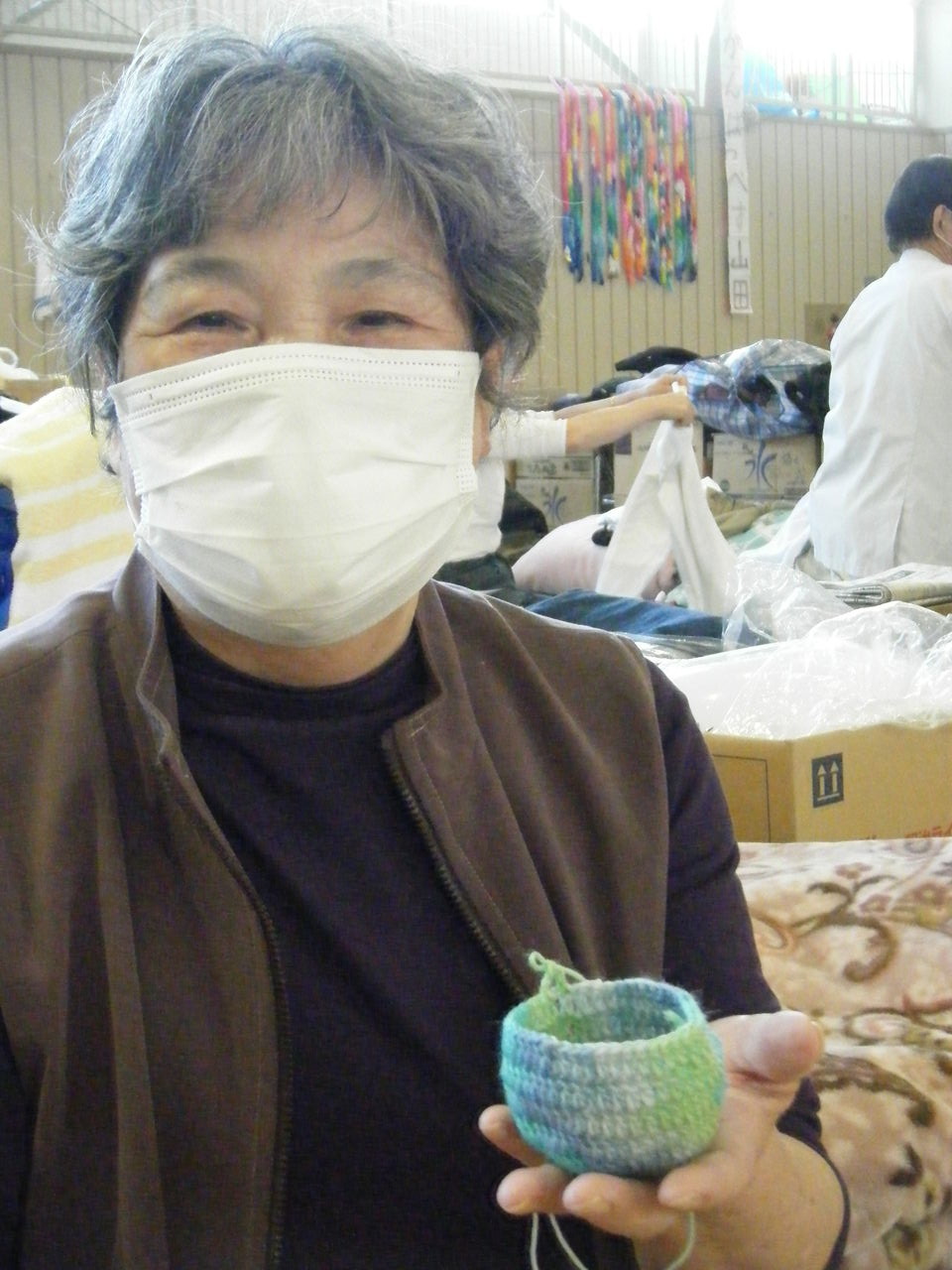 炊き出しの準備が一段落した所で、同じ山田高校の体育館で避難生活をされている方達に編み物キットをお届けに行きました。