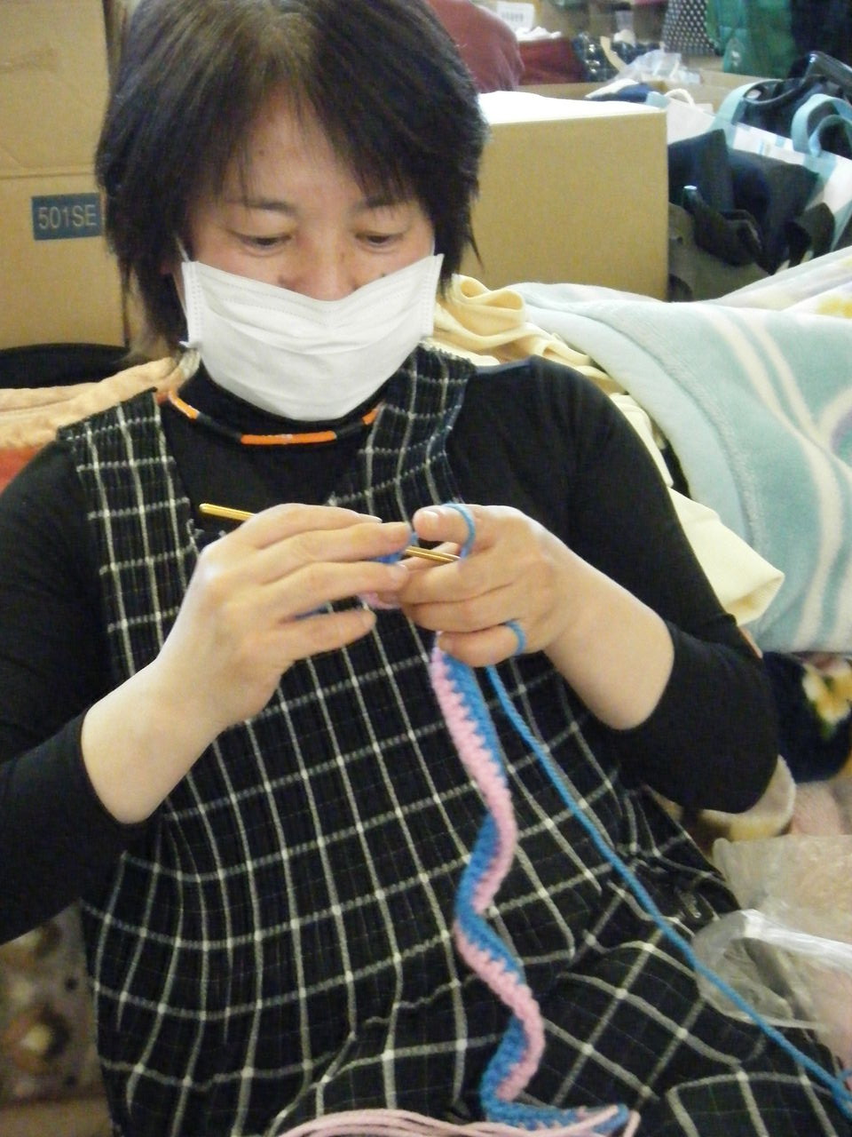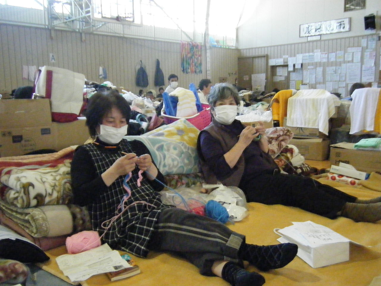 先週は大船渡の避難所4箇所を回りましたので、編み物キットは受付にお預けしてきたのですが、今回は時間が充分ありましたので、皆さんとお話しをしながらお配りしました。沢山の人たちが興味を持ってあれこれ選んでおられました。