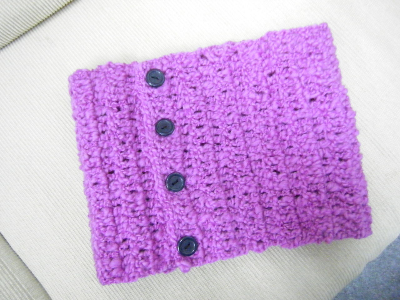 ネックウォーマーにはかわいいボタンが付いています。つぎつぎ湧いてくるデザインも楽しみに編まれているようです。