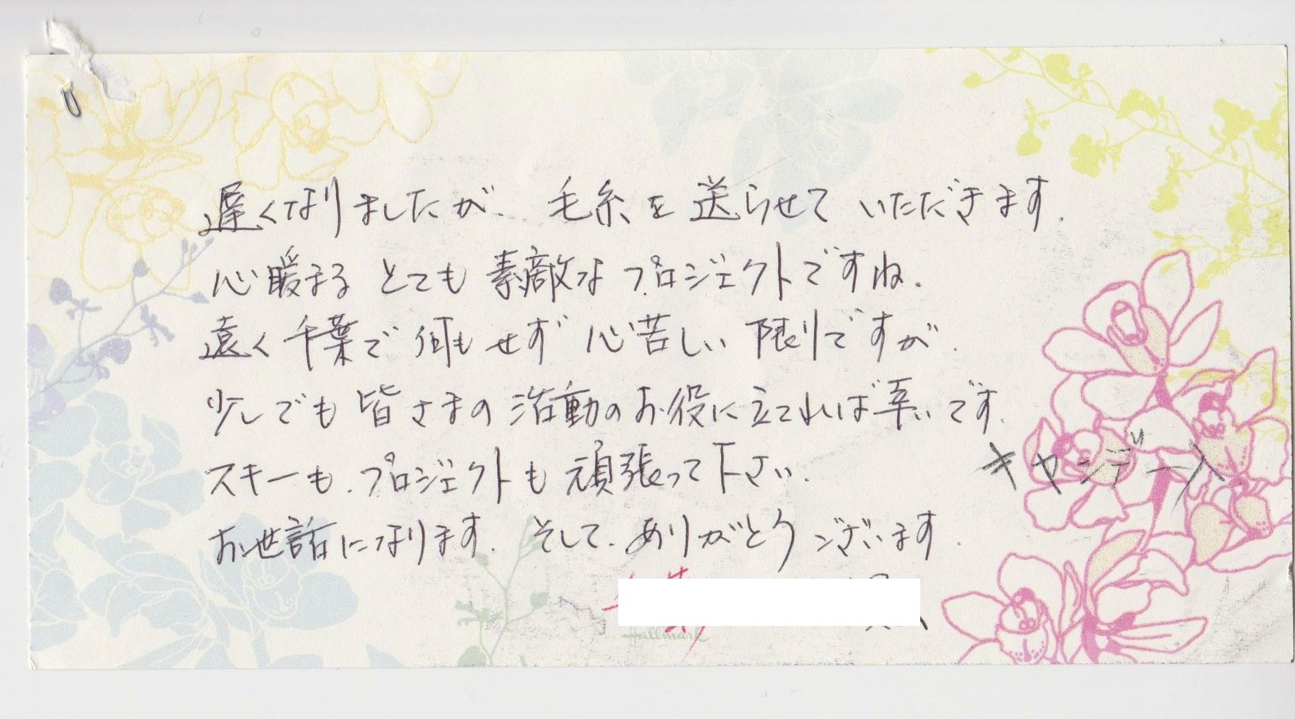 スキー仲間からも、お届け頂きました毛糸とともにプロジェクトに励ましのお手紙を頂戴しています。