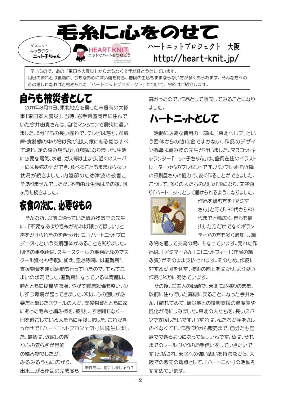 ハートニットプロジェクト関西地区を担当しているボランティアの活動が、フリーペーパー「ひろば」で取り上げら取材を受けました。