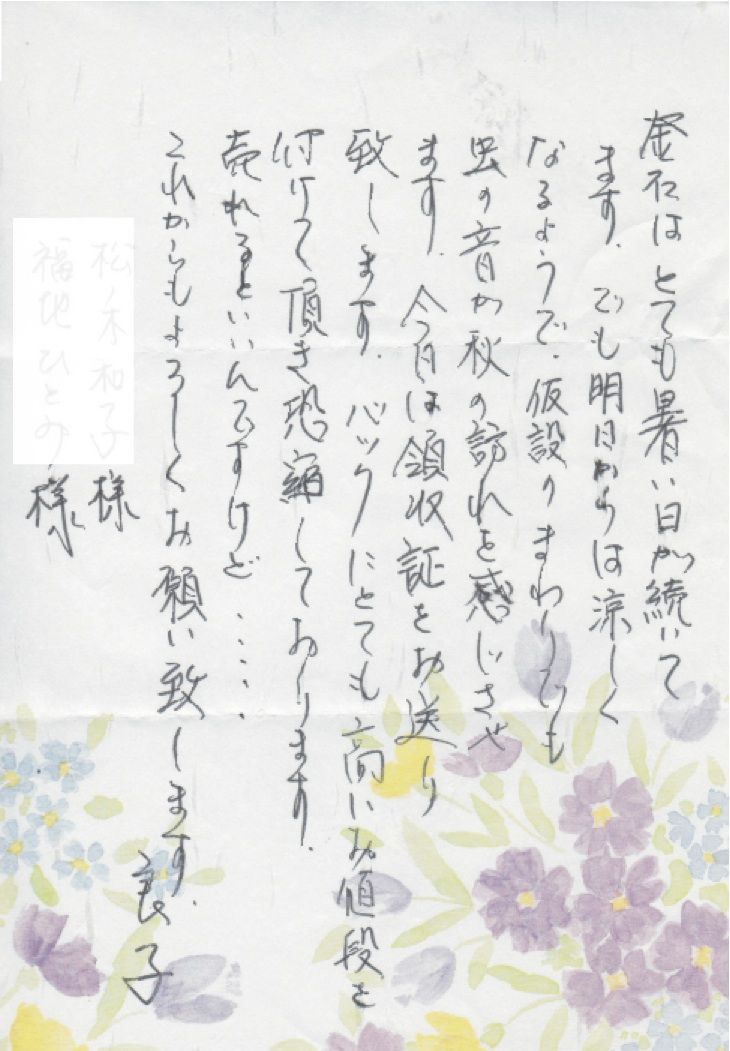 作品名・納品数を記した伝票に合わせて、お振り込み金額の領収書を添えてお届けします。それにサインをして頂き、返送をお願いしています。